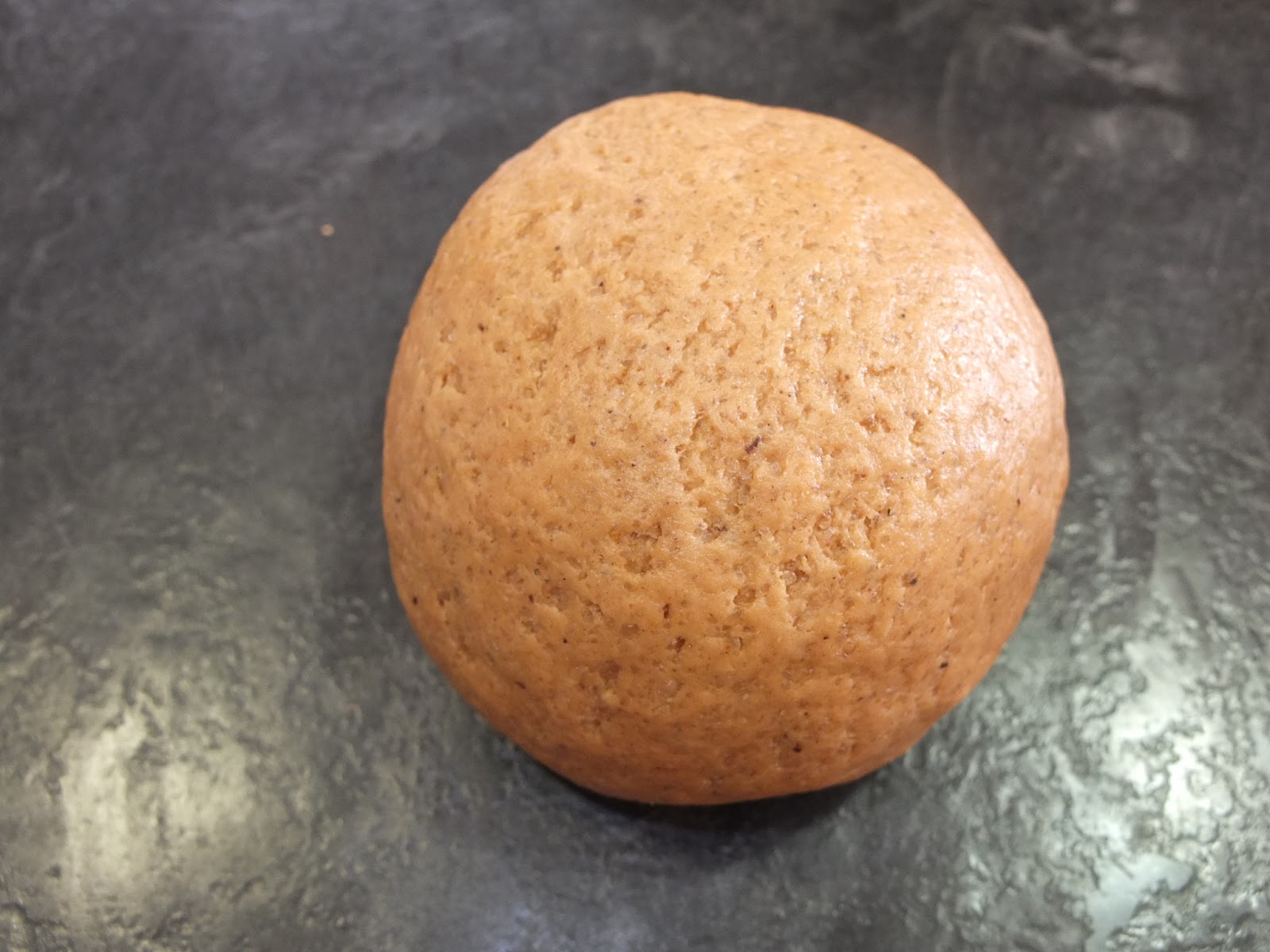 3. Vertemos sobre la superficie de trabajo y amasamos hasta que quede todo integrado. Formamos una bola, cubrimos con film y dejamos reposar 24 horas en la nevera.