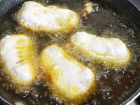 Esto serían unos fritos de bacalao. Para convertirlos en Soldaditos de Pavía le ponemos las tiritas de pimiento rojo que pueden ser asados. Yo, cómo tenía prisa, he cortado unas tiritas de pimientos y los he frito en un poco de aceite, mientras se hacía el bacalao.