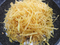 3. Las dejamos a remojo y lavamos varias veces para quitarles todo el almidón, de lo contrario, se quedarían pegadas unas a otras. A continuación, las secamos bien y las freímos por tandas en abundante aceite bastante caliente pero no demasiado. Dejamos un minuto sin mover y después las soltamos y dejamos hasta que no suelten agua, lo notarás porque dejan de burbujear y de hacer ruido, y cojan un ligero tono dorado.
